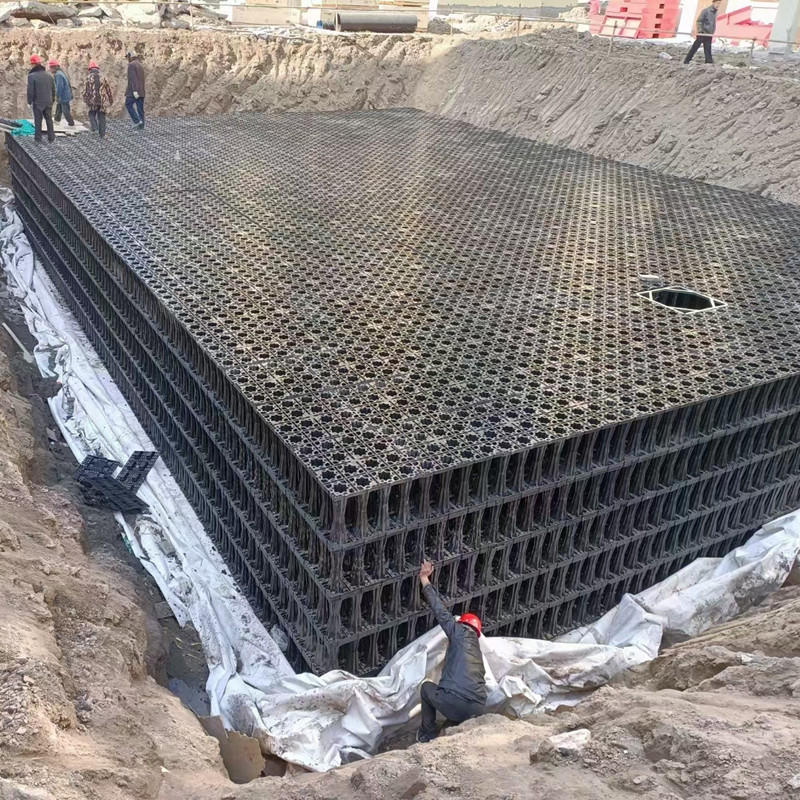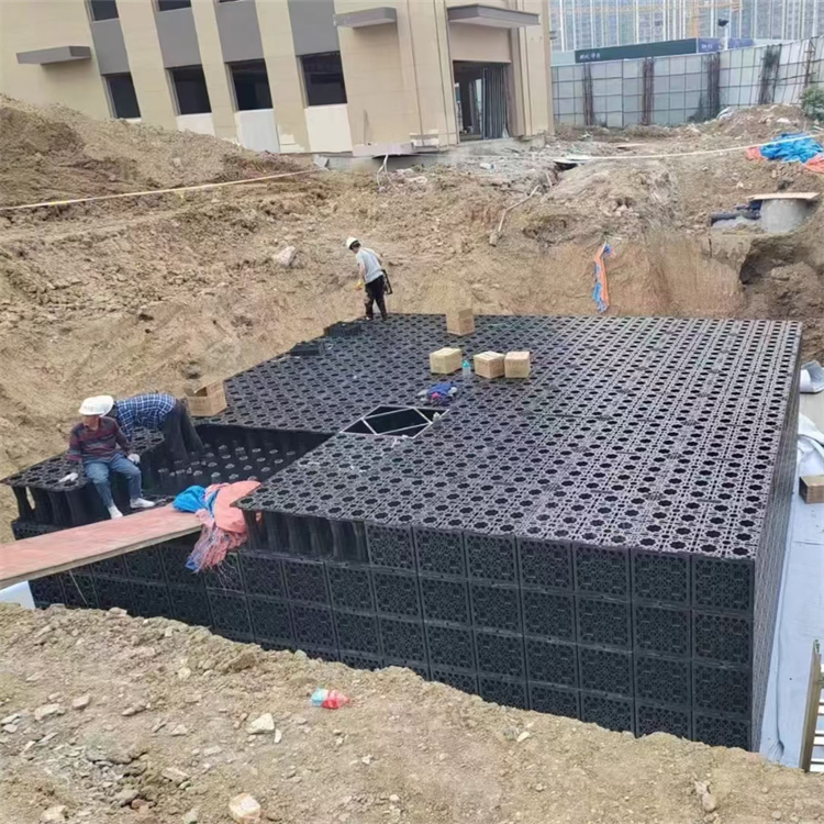 海綿城市蓄水模塊包括主板 側(cè)板 定位銷(xiāo) 連接扣 墊腳 復(fù)合膜蓄水池挖好后要先做30公分混凝···